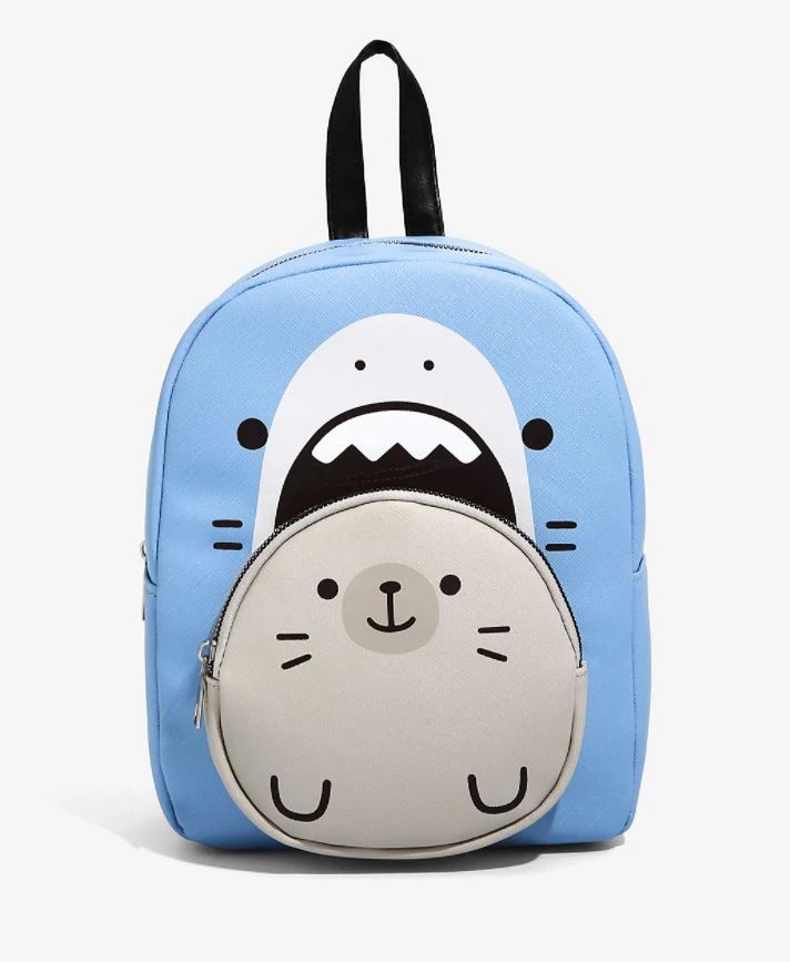The Samezu Shark pals are here to help carry around all of your essentials for your next food adventure! Featuring the great white shark, Jaggy, and his pal (or next meal!) Yummy the seal, the adorable aquatic pair appear as this mini backpack’s figural details, with Yummy acting as the front pocket to appear as a friendly embrace between him and Jaggy, who appears as the larger part of the bag. Complete with adjustable shoulder straps and silver-toned hardware, this bag is just the thing for your next picnic…as long as you make sure there’s enough food for Jaggy!