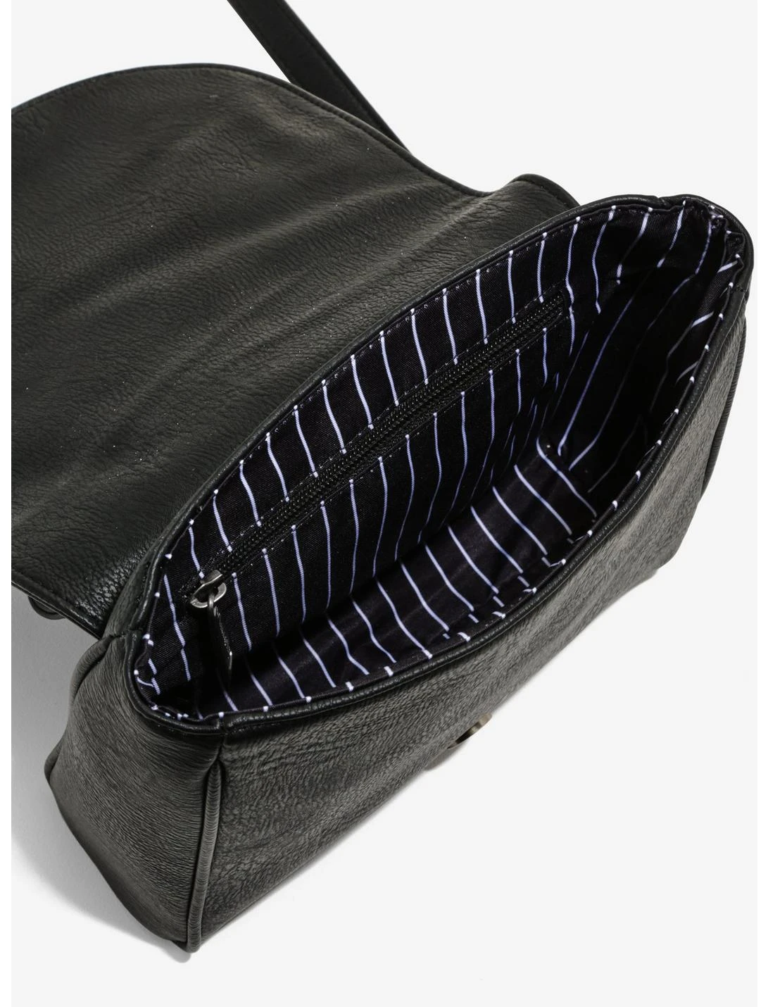 This bag was inspired byThe Nightmare Before Christmasand Jack Skellington’s spooky, smiling face. With a printed and studded design, this bag features a magnetic closure, internal zipper pocket and adjustable crossbody strap.
