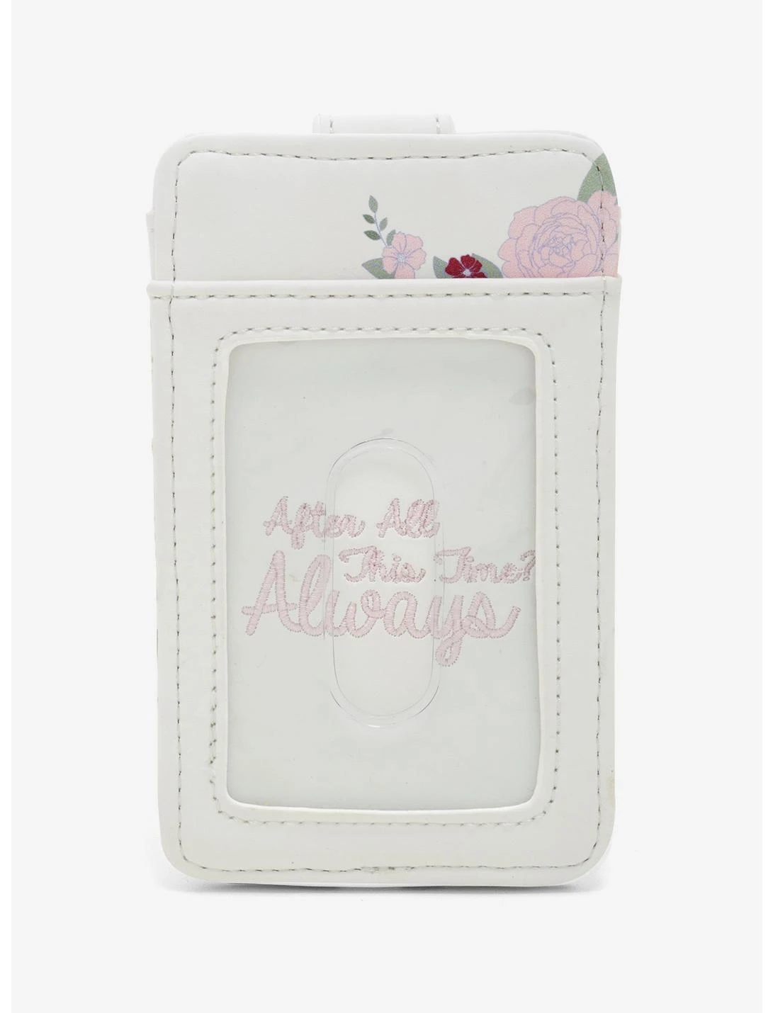 Shop in style with thisHarry Pottercardholder, always. There is “After all this time? Always” embroidered text design behind the clear ID display. On the other side is 4 card slots with snap closure of a gold Hogwarts crest and “Always” embroidered text design. The pink & maroon floral design features