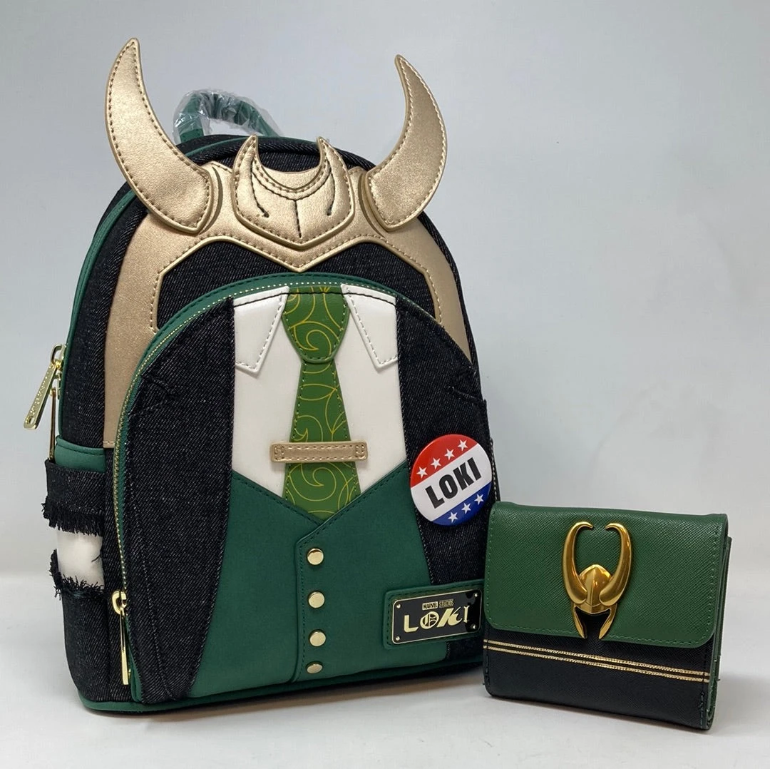 Loki has chosen a not-so-discrete disguise in order to infiltrate your Marvel collection as the NYCC 2021 Virtual Con Exclusive – Marvel President Loki Cosplay Mini Backpack. Lokis metallic helmet rests on top of his dapper black and green suit. The green and gold tie coordinates nicely with the gold rivet buttons and the metallic tie bar. The Loki button on the lapel ties the whole look together though.