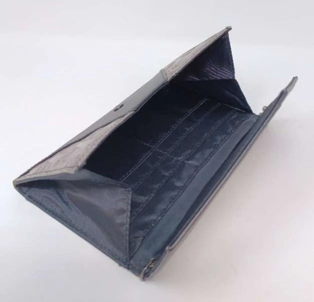 Faux leather, w/ twosilver contrasting panels embossed w/ a repeating stormtrooper helmet design. The front flap features an embossed Imperial cog symbol appliqu & closes w/ a standard button dome clasp. Lined inside w/ black fabric, w/ 6 card slots & one bill slot. The back has an open pocket, which is also lined in black fabric. When closed it measures approximately 6 x 4 x 1 inches