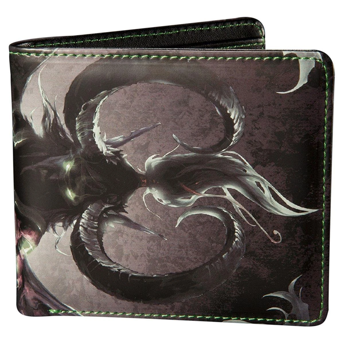 Show off your love of Warcraft wherever you go with this men’s bifold wallet inspired by the character Illidan Stormrage! Featuring durable polyurethane construction with contrasting green stitching, this Warcraft-themed bifold wallet features a Illidan Stormrage video game wrap-around print on the outside and a World of Warcraft logo embossed on the inside panel. Includes money pocket, 5 card pockets, with additional translucent ID window pocket. Officially licensed. Designed and created by JINX.